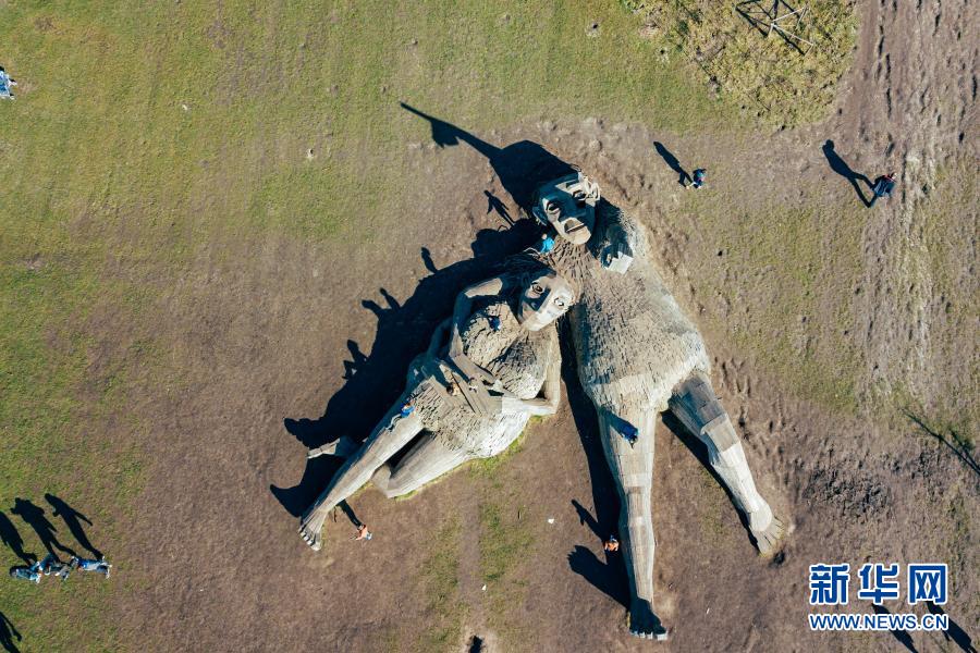 這是3月20日在比利時博姆市的德舒爾森林公園拍攝的“巨人”雕塑(無人機(jī)照片)。新華社記者 張鋮 攝