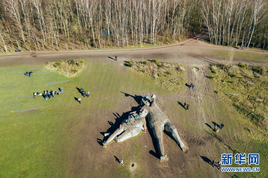 這是3月20日在比利時(shí)博姆市的德舒爾森林公園拍攝的“巨人”雕塑(無人機(jī)照片)。新華社記者 張鋮 攝