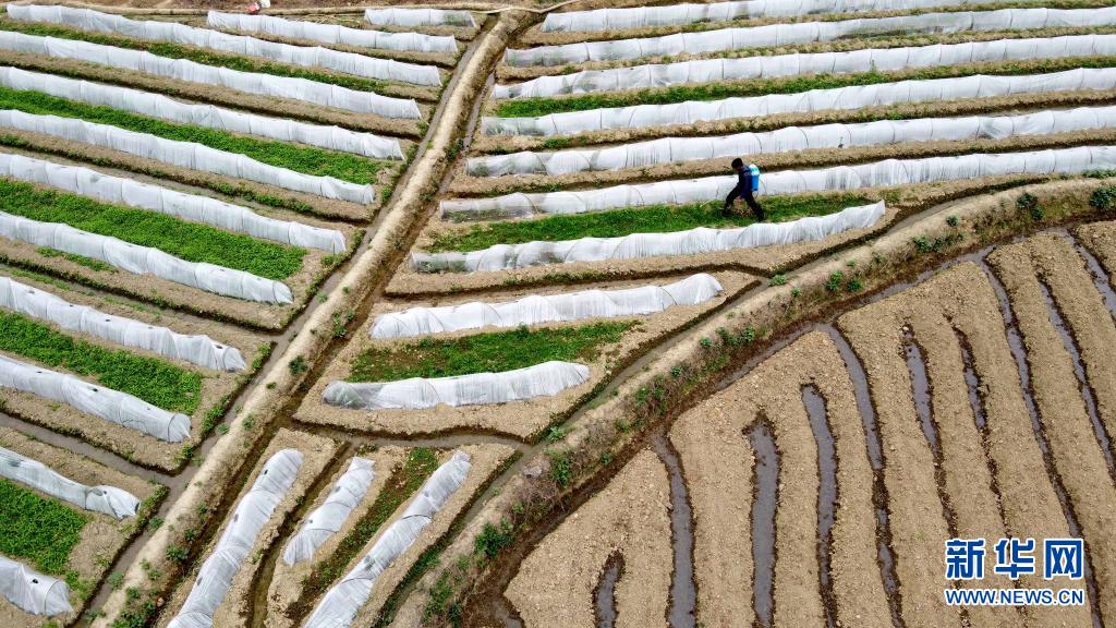 4月5日,在福建省龍巖市永定區(qū)培豐鎮(zhèn),農(nóng)民在田間勞作(無(wú)人機(jī)照片)。