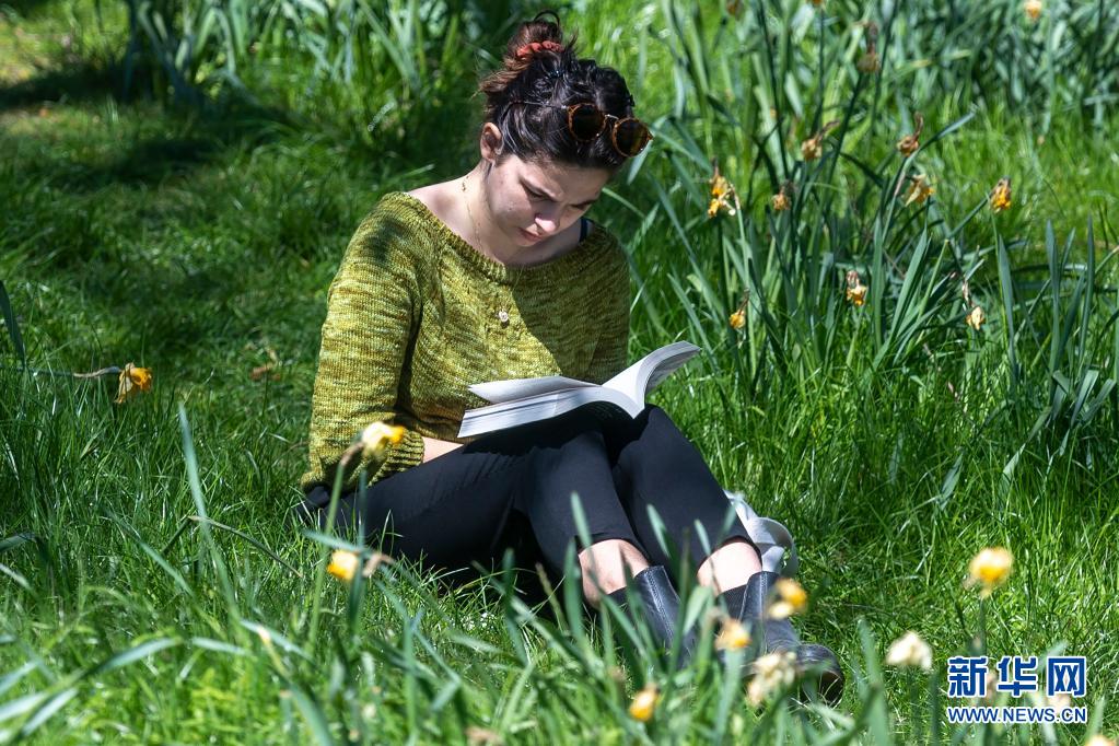 4月17日,一名女子在英國倫敦一個(gè)公園的花叢中讀書。