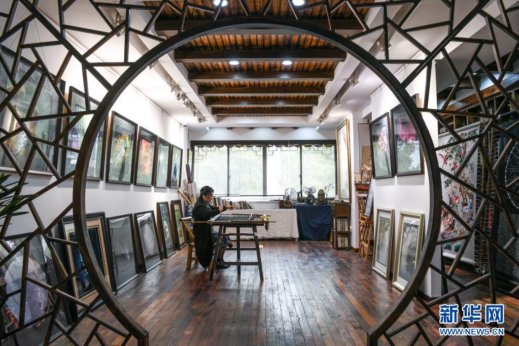 陳英華在位于蘇州高新區(qū)鎮(zhèn)湖街道的蘇繡工作室內(nèi)刺繡(4月14日攝)。新華社記者 李博 攝