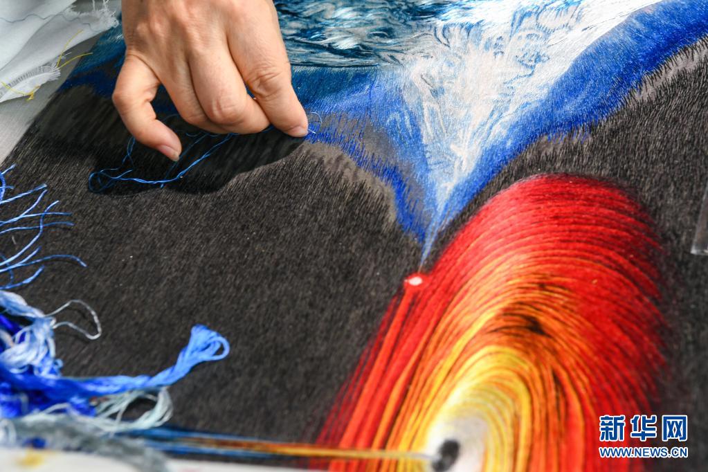 陳英華在位于蘇州高新區(qū)鎮(zhèn)湖街道的蘇繡工作室內(nèi)刺繡(4月14日攝)。新華社記者 李博 攝