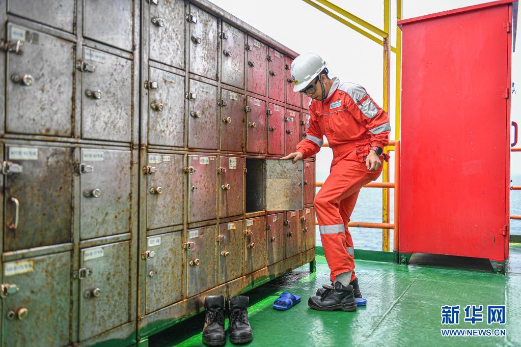 4月25日,中國海油樂東15-1氣田上的一名工人在進入氣田作業(yè)區(qū)之前戴上安全帽并換上有助于保護腳部的工作靴。
