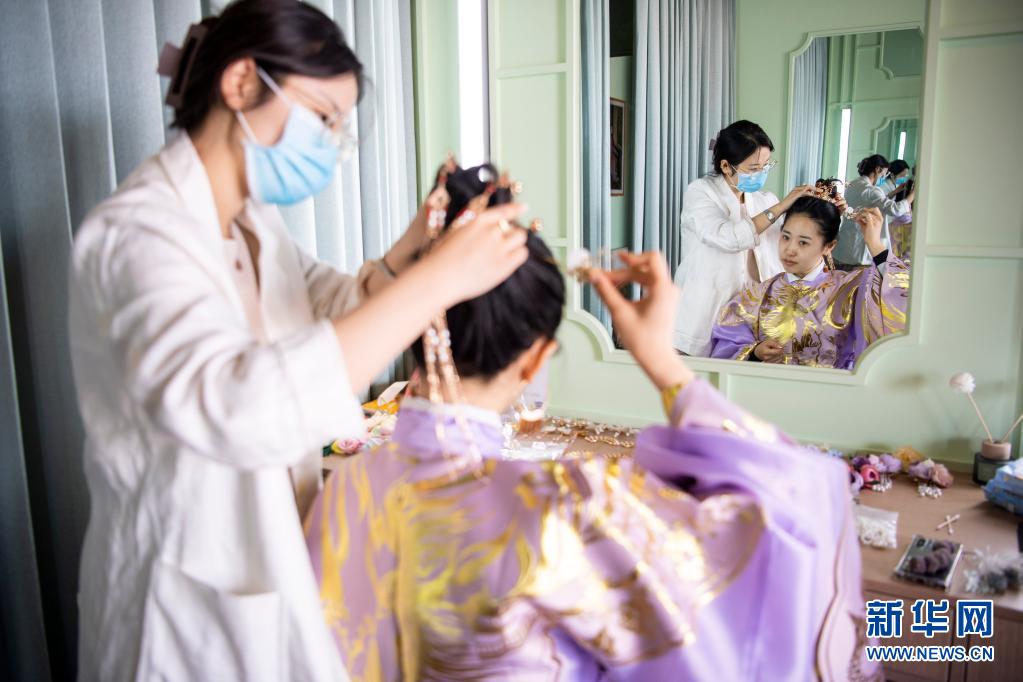 5月4日,在太原古縣城的一家店鋪內(nèi),游客化妝準(zhǔn)備體驗古風(fēng)拍攝。
