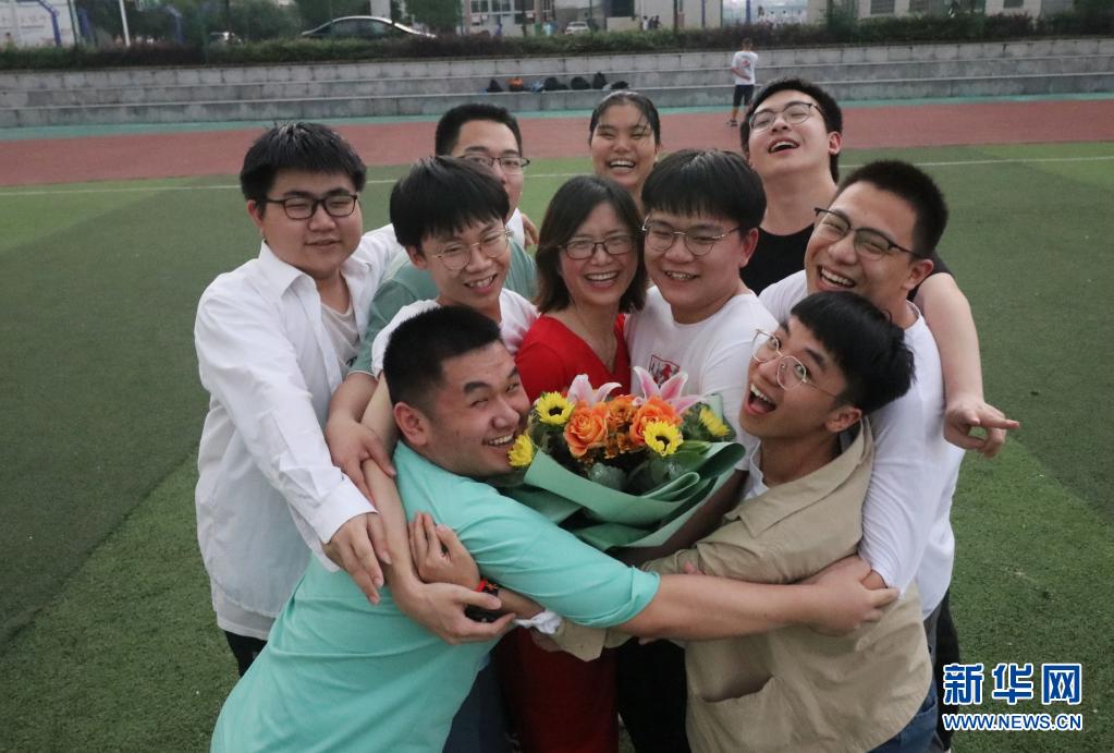 6月9日,在湖南省婁底市第四中學(xué),完成高考的老三李慶民(中排右二)和老師同學(xué)們?cè)谝黄稹?/p>