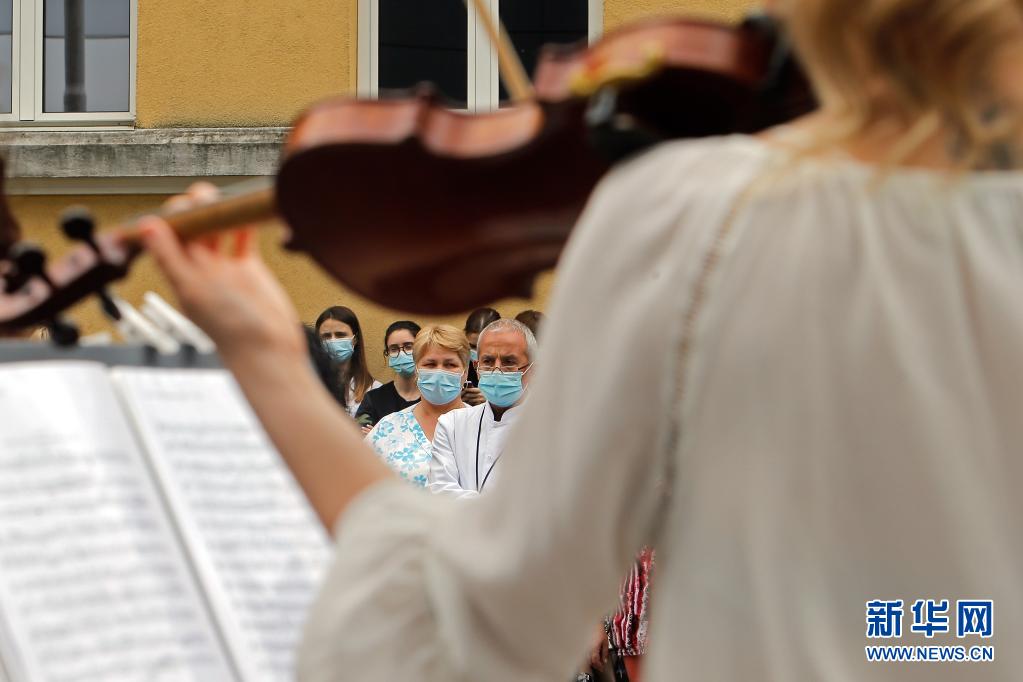 當日,羅馬尼亞首都布加勒斯特一個樂隊在該國一家傳染病醫(yī)院——馬太·巴爾什醫(yī)院演出,向抗擊新冠疫情的醫(yī)務(wù)工作者致謝。