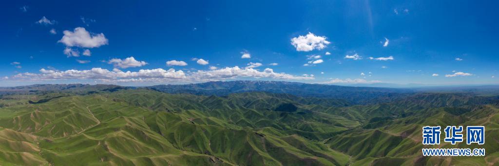 新疆北部裕民縣巴爾魯克山區(qū)夏牧場(chǎng)(6月15日攝,無人機(jī)全景照片)。