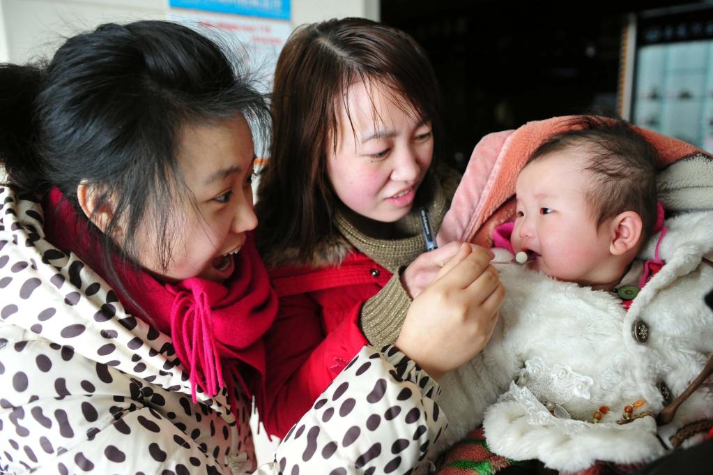 2011年3月1日,新疆烏魯木齊,工作人員給一名孩子喂食脊髓灰質炎疫苗“糖丸”。 新華社記者 江文耀 攝