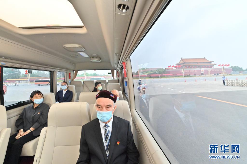 這是買(mǎi)買(mǎi)提江·吾買(mǎi)爾(前)、張桂梅(左一)、吳天一(右一)乘車(chē)前往人民大會(huì)堂。