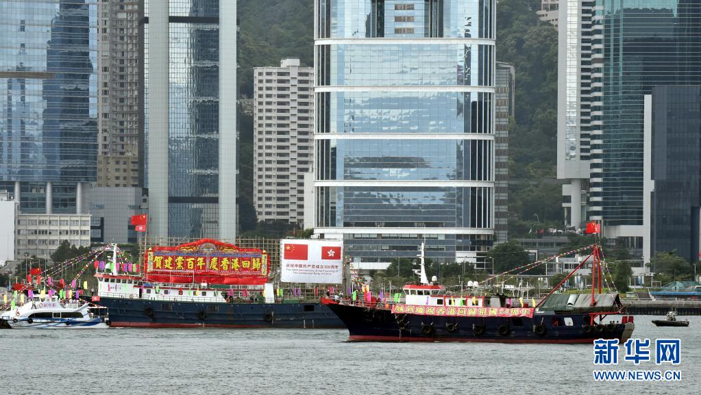 7月1日,懸掛國旗、區(qū)旗的漁船在維港巡游。新華社記者 盧炳輝 攝