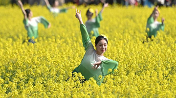 3月27日,在江西省宜春市万载县第二小学,学生在花灯戏剧团演员的指导下进行戏曲形体训练。