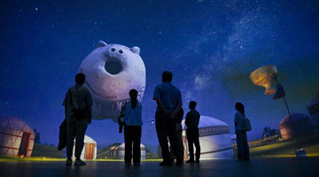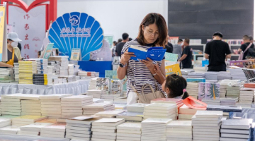 9月1日,参观者在艺术展上展出的摄影作品前驻足观看。
