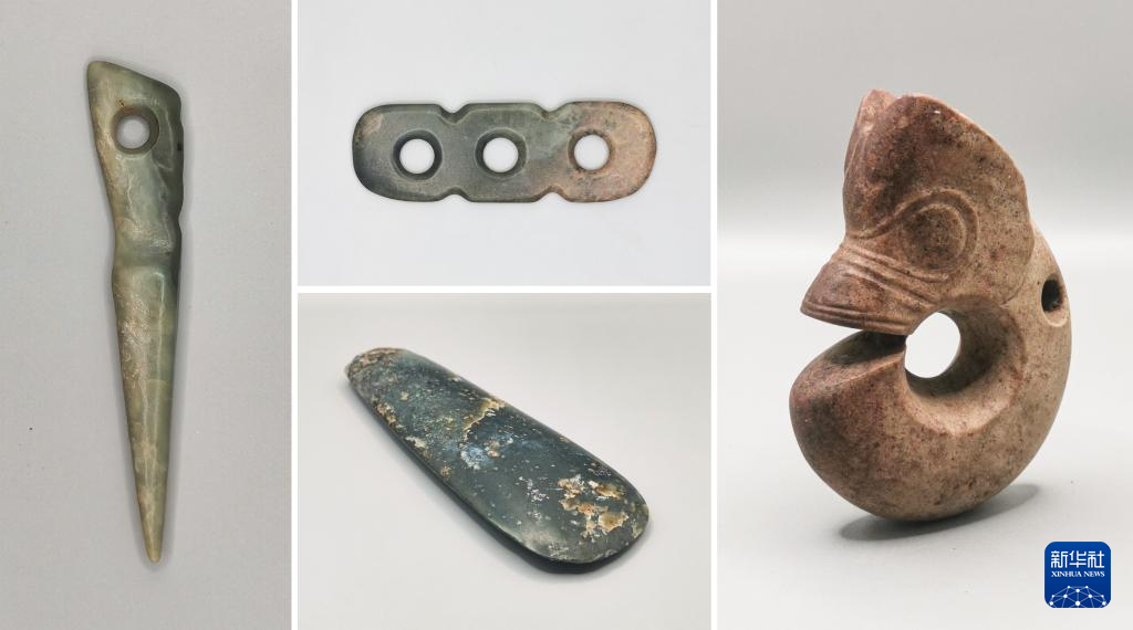 拼版照片:河北张家口市郑家沟红山文化遗址1号积石冢出土的部分玉器(资料照片)。