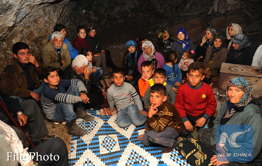 Syrian Kurdish people stay in a cave in a village in the countryside of the Kurdish-controlled enclave of Afrin, northern Syria, on Feb. 8, 2018. Civilians in the countryside of Afrin have been fleeing their areas to safer places since the Turkish-led military campaign started against Kurdish fighters in Afrin. (Xinhua/Ammar Safarjalani)