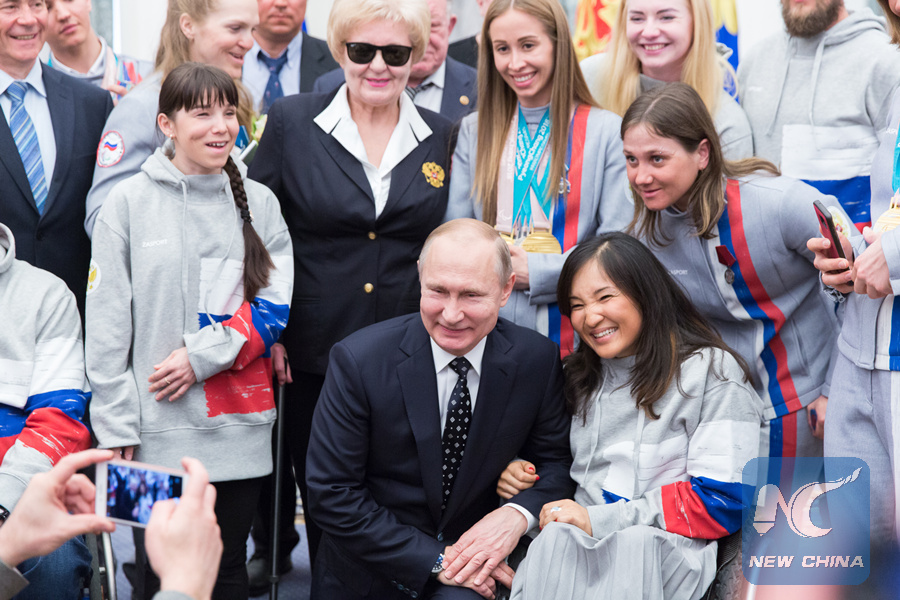 Russian President Vladimir Putin (C) poses with prizewinners of the Pyeongchang 2018 Winter Paralympics during an awarding ceremony in Moscow, Russia, on March 20, 2018. (Xinhua/Bai Xueqi)