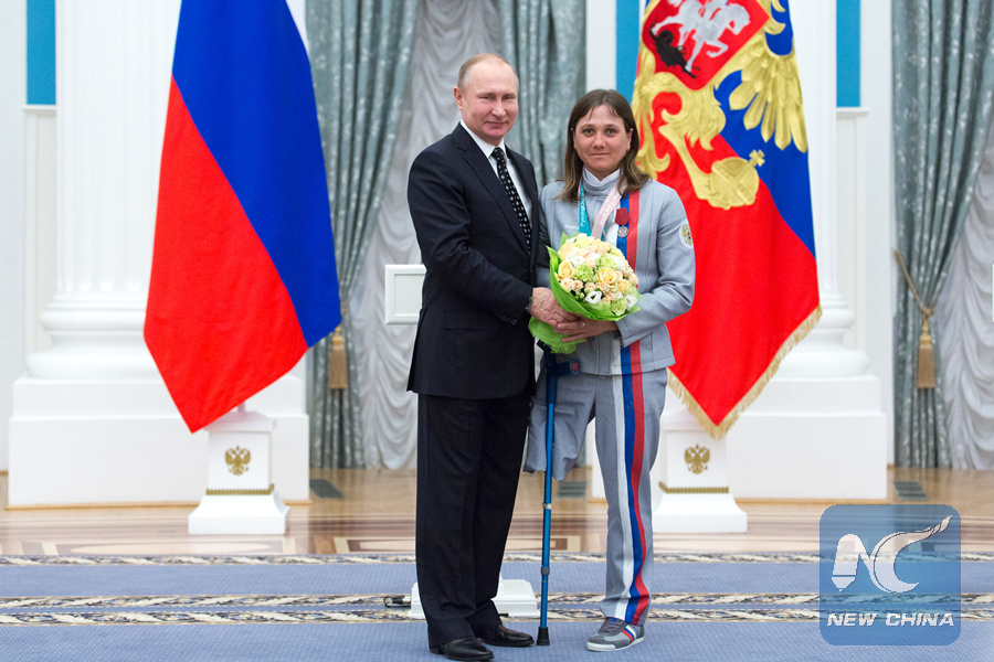 Russian President Vladimir Putin (L) poses with Irina Gulyaeva, a prizewinner of the Pyeongchang 2018 Winter Paralympics during an awarding ceremony in Moscow, Russia, on March 20, 2018. (Xinhua/Bai Xueqi)