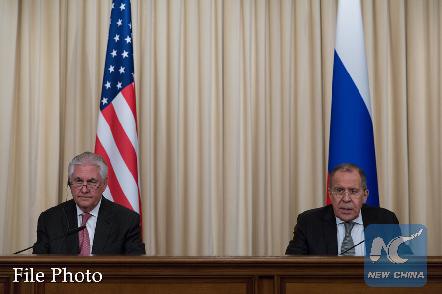U.S. Secretary of State Rex Tillerson (L) and Russian Foreign Minister Sergei Lavrov attend a joint press conference in Moscow, Russia, on April 12, 2017. (Xinhua/Bai Xueqi)