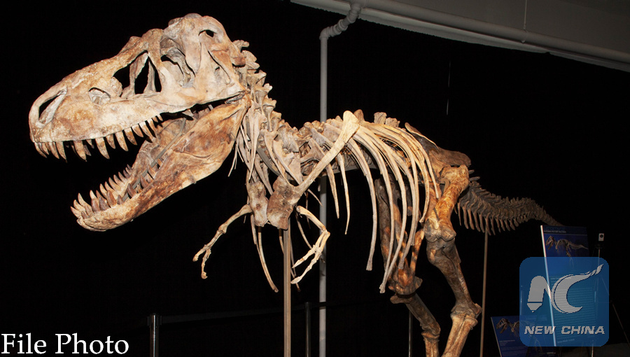 This undated file photo courtesy of the Manhattan US Attorney's office shows a nearly complete Tyrannosaurus bataar dinosaur skeleton looted from the Gobi Desert in Mongolia.(AFP)