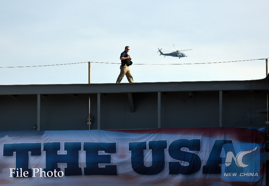 A soldier patrols on USS Gerald R. Ford before its commissioning ceremony at Naval Station Norfolk, Virginia, the United States, on July 22, 2017. (Xinhua/Yin Bogu)