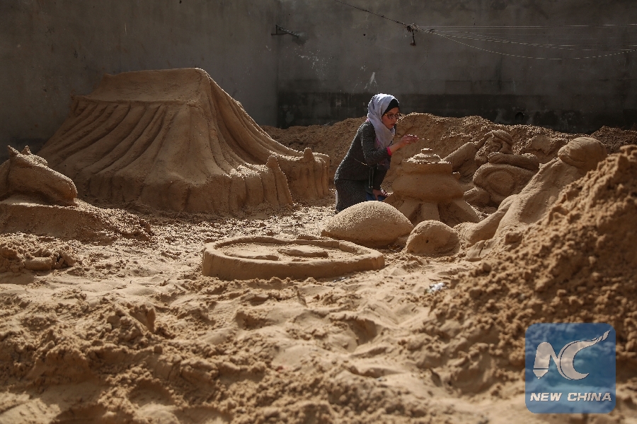 Palestinian young woman Rana Ramlawi carves sand sculptures inside her house in Gaza City, on Jan. 24, 2019. (Xinhua/Stringer)