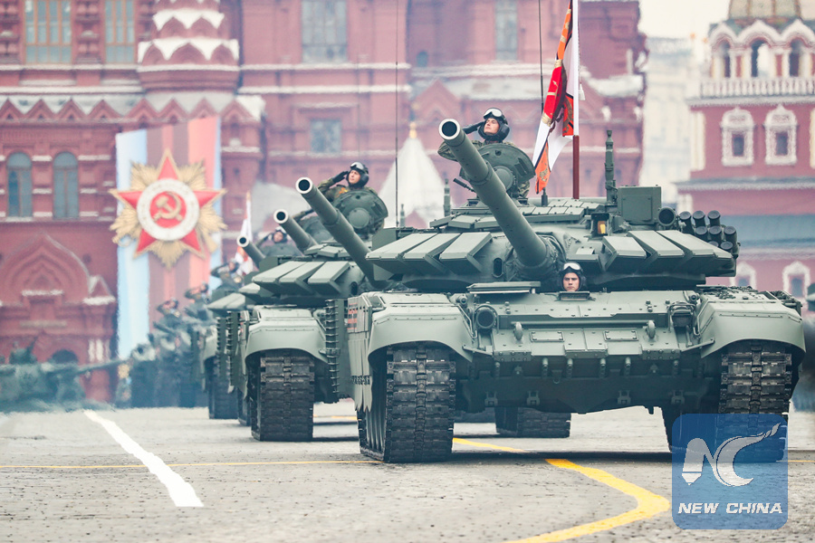 Russian T-72 B3 tanks roll through the Red Square during the Victory Day military parade in Moscow, Russia, on May 9, 2019. (Xinhua/Bai Xueqi)