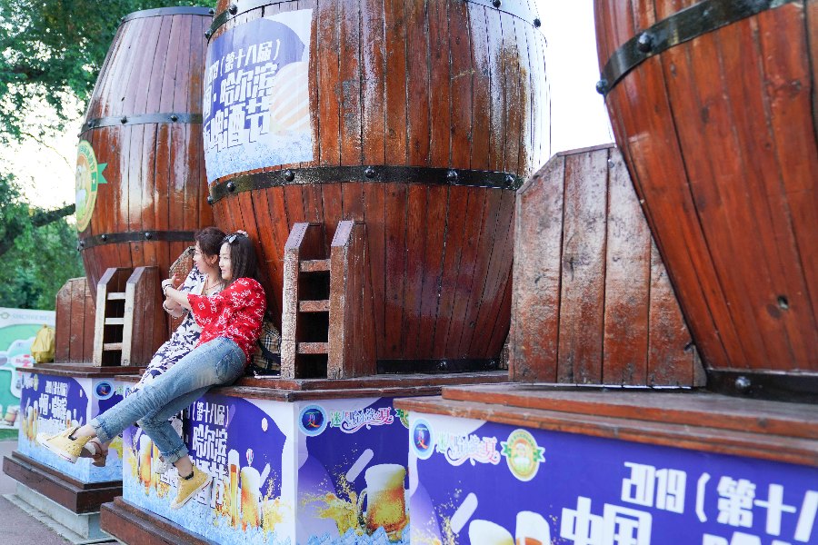 People pose for photos during the beer festival in Harbin, capital of northeast China's Heilongjiang Province, June 20, 2019. (Xinhua/Wang Song)