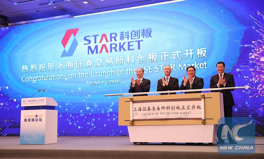 Honored guests preside over the launching ceremony of the sci-tech innovation board of the Shanghai Stock Exchange at the Lujiazui Forum in Shanghai, east China, June 13, 2019. (Xinhua/Fang Zhe)