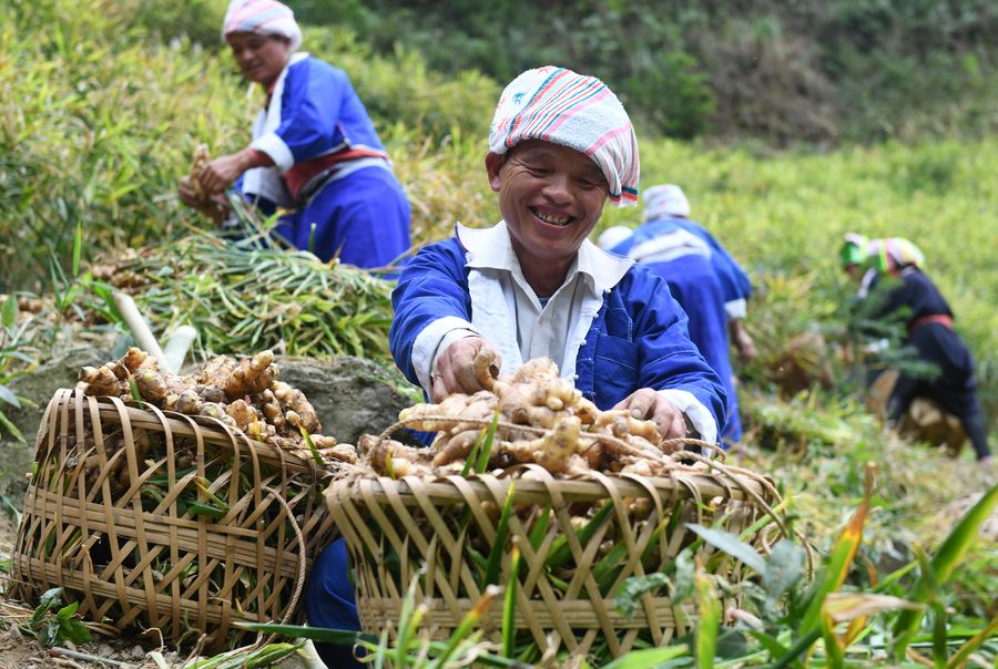 Villagers of Yao ethnic group harvest gingers at Caodui Village of Etang Township in Pinggui District of Hezhou City, south China's Guangxi Zhuang Autonomous Region, Nov. 12, 2019. Six poverty-stricken villages in Pinggui District are engaged in ginger planting, which help increase villagers' income. (Xinhua/Lu Boan)