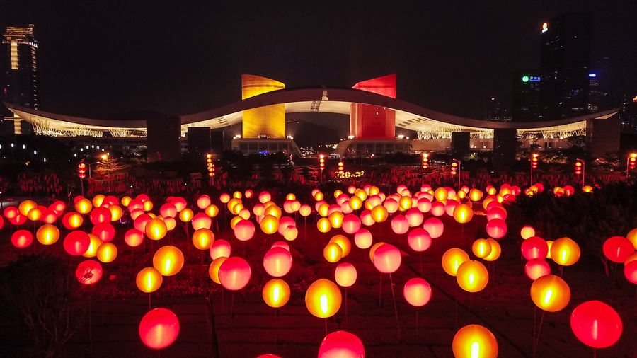 Aerial photo taken on Jan. 19, 2020 shows lanterns being illuminated to greet the coming Spring Festival in Shenzhen, south China's Guangdong province. (Xinhua/Mao Siqian)