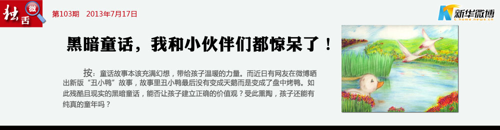 【黑暗童話也有正能量】 兒童閱讀黑暗童話——丑小鴨變烤鴨并不可怕,這是一種挫折教育。孩子的成長需要適度的挫折教育。一直活在象牙塔里的孩子,在走入社會之后很難適應(yīng)現(xiàn)實的生活,他們常常因為學業(yè)或工作中的一點挫折而走向極端。因此,在其進入社會之前進行適度的挫折教育必不可少。