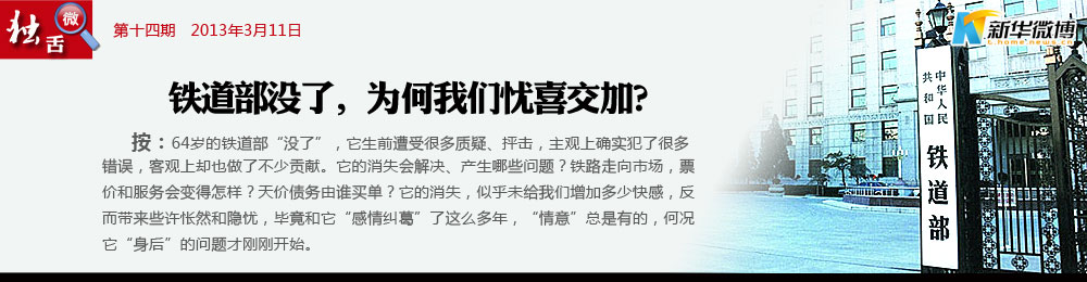 @秋水伊人:之前累積的債務(wù)問題如何解決?誰是還債主體?明年春運(yùn)被“吐槽”的是誰?撤銷鐵道部體現(xiàn)了改革的決心,希望能有好的轉(zhuǎn)變。