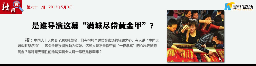 【黃金周?NO!是搶金周!】 “五一”假期,“黃金周”變成了“搶金周”,金店堪比景點(diǎn),金飾變成普通老百姓的“撈底”對(duì)象?!?br />