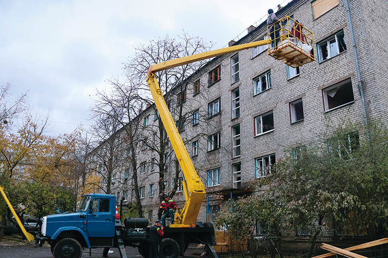 2025 年 10 月 25 日,在乌克兰基辅第聂伯区,人们加固在空袭中受损的居民楼窗户