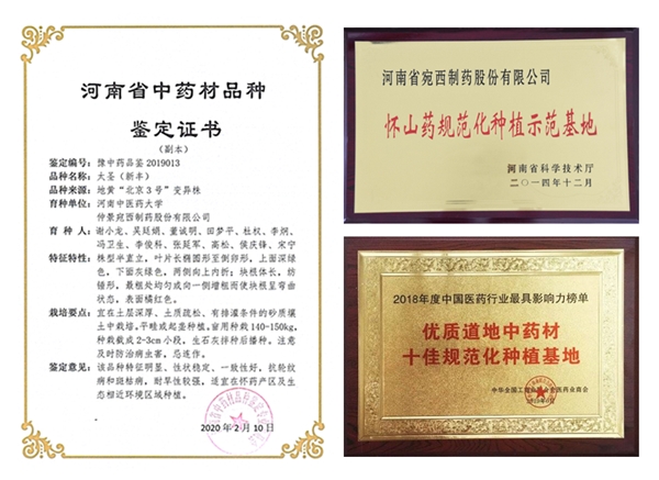 仲景宛西制藥是國內首家提出“藥材好,藥才好”理念的企業(yè),有自建的中藥材種植基地,藥材地道,藥源清晰。是最早一批通過中藥材生產管理規(guī)范(GAP)認證的企業(yè)之一,得到了政府部門、行業(yè)協(xié)會等社會各界廣泛認可。其中懷山藥、懷地黃基地被授予“河南省規(guī)范化種植示范基地”、山茱萸基地“中國優(yōu)質地道中藥材十佳規(guī)范化種植基地”。