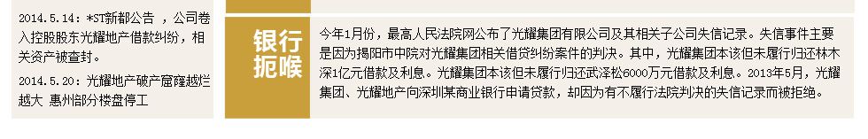 興潤崩盤,曾被媒體評論為“推倒了2014年中小房企崩盤的第一張多米諾骨牌”。隨后,資金鏈斷裂、房企破產(chǎn)、項(xiàng)目爛尾等聲音此起彼伏,這些案例中,最令市場關(guān)注的,莫過于近日瘋傳的“光耀地產(chǎn)資金鏈斷裂”事件。5月7日光耀地產(chǎn)公開發(fā)表聲明,承認(rèn)公司面臨資金鏈問題,但否認(rèn)了瀕臨破產(chǎn)的說法,之后也表示愿意接受其他企業(yè)的收購。 |