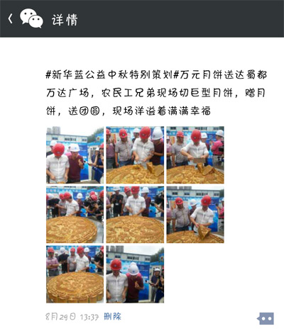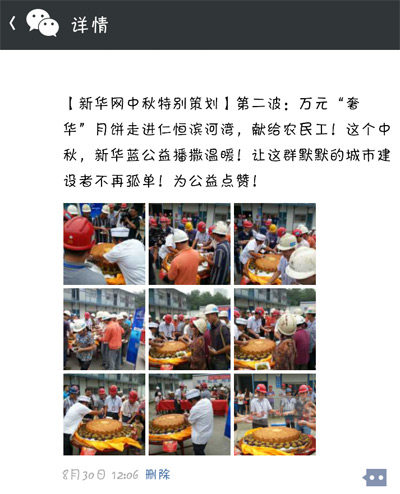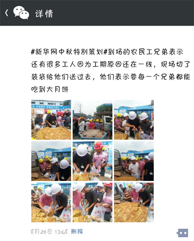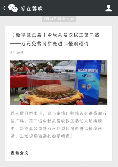 為了給這些身在異鄉(xiāng)的農(nóng)民工兄弟送去溫暖,新華藍公益特別為他們舉辦了一場“中秋關(guān)愛農(nóng)民工特別活動”,現(xiàn)場為工人捐贈月餅。8月29日上午10:30,本次活動在成都沙灣會展中心如期啟動。