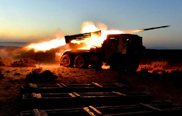 Soldiers fire a truck-mounted rocket launcher to strike the simulated enemy during the live-fire training exercise. The "Firepower-2015 Qingtongxia D" trans-Military Area Command (MAC) live-fire military exercises, participated by troops from a regiment under the 21st Group Army of the PLA Lanzhou MAC and an artillery brigade under the 16th Group Army of the PLA Shenyang MAC, concluded at a training ground of the PLA Lanzhou MAC on the afternoon of August 16, 2015.