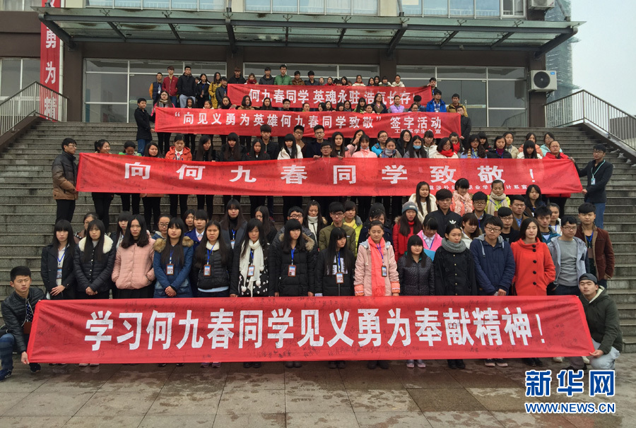 危難時刻挺身而出,英雄壯舉催人淚下。何九春的同學們紛紛自發(fā)的打出標語,向何九春致敬。