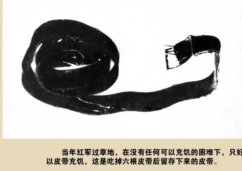 原來(lái),這條皮帶是周廣才在1934年的一次戰(zhàn)斗中繳獲敵人的戰(zhàn)利品。但為了使全班戰(zhàn)友活下來(lái),他只得含淚將皮帶拿出來(lái)。皮帶被切成幾段丟入滾燙的熱水中,煮熟后每人夾起“一截”狼吞虎咽的吃起來(lái)……當(dāng)鍋里還剩最后“一截”時(shí)他哭著說(shuō):“同志們,咱們留著它作個(gè)紀(jì)念吧,帶到延安去見(jiàn)毛主席?!睉阎鴮?duì)革命勝利的無(wú)限渴望,最終他們把這截皮帶留了下來(lái)。