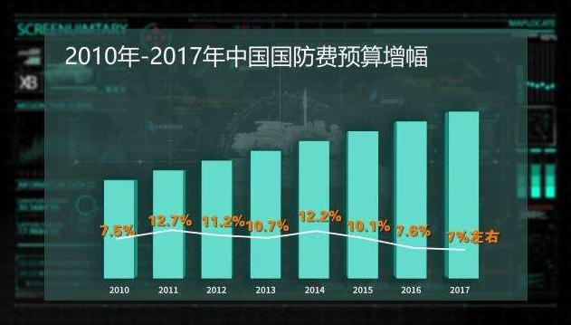 2017年3月4日,全國人大新聞發(fā)言人傅瑩在北京透露,2017年中國國防預算增幅在7%左右。