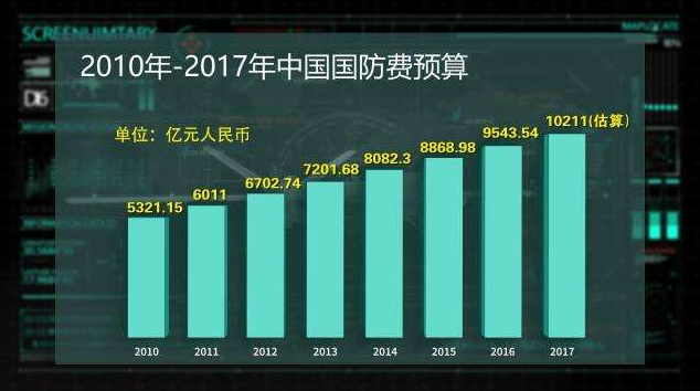 自1999年超過1000億元人民幣,到2017年突破10000億元人民幣,中國的國防實力上了一個新臺階,國防建設與經(jīng)濟建設協(xié)調發(fā)展進入了一個新階段。