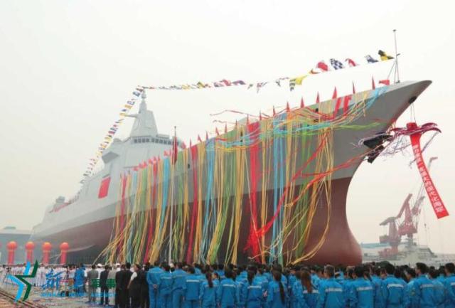 ?。箷r(shí)許,儀式開(kāi)始,隨著儀式現(xiàn)場(chǎng)全體人員齊聲高唱的國(guó)歌聲,鮮艷的五星紅旗冉冉升起。剪彩后進(jìn)行了“擲瓶禮”,一瓶香檳酒在艦艏摔碎,絢麗的彩帶從兩舷噴射而出,新型驅(qū)逐艦鳴響汽笛,全場(chǎng)響起熱烈掌聲。隨后,驅(qū)逐艦在拖曳牽引下緩緩移上浮箱后下水。