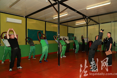 ????“左手抓對(duì)方拇指向外旋,右手托對(duì)方肘部,轉(zhuǎn)跨、擰腰……”警務(wù)實(shí)戰(zhàn)教官王變闖一邊神情自若地講解著動(dòng)作要領(lǐng),一邊干脆利落地完成一個(gè)精彩的“控腕翻肘”解脫動(dòng)作演示,配手應(yīng)聲倒地“就范”?!癢ow……Good!”伴隨著一陣驚嘆,現(xiàn)場(chǎng)膚色各異的國(guó)際“學(xué)員”紛紛向中國(guó)教官豎起大拇指,報(bào)以雷鳴般的掌聲。近日,中國(guó)第五支駐利比里亞維和警察防暴隊(duì)警務(wù)實(shí)戰(zhàn)培訓(xùn)班在任務(wù)區(qū)“驚艷”亮相。
