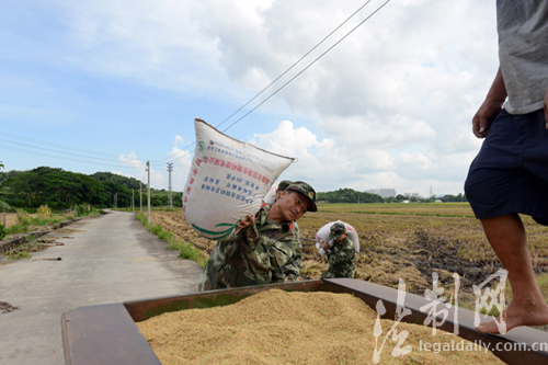 ????據(jù)悉,眼下正是稻谷收割農忙季節(jié),廣東中山邊防支隊沙頭涌邊防派出所官兵每年定期來到田間地頭,解決駐地農戶勞動力不足的問題,并與他們一起分享豐收的快樂。(肖亭)