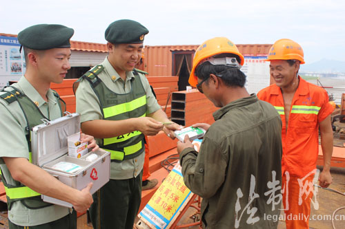 圖為龍港邊防派出所官兵為當(dāng)?shù)靥镩g作業(yè)的農(nóng)戶(hù)送去防暑藥品