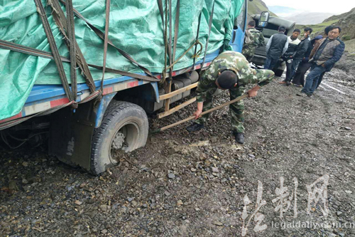 ????連日來(lái),受強(qiáng)降雨天氣影響,通往西藏山南市錯(cuò)那縣卡達(dá)鄉(xiāng)道路因山體塌方和泥石流損毀嚴(yán)重,7月23日中午12時(shí),西藏邊防總隊(duì)山南邊防支隊(duì)卡達(dá)邊防派出所接轄區(qū)居民電話(huà)報(bào)警稱(chēng):商店運(yùn)貨貨車(chē)在返回卡達(dá)鄉(xiāng)途中陷入泥潭,請(qǐng)求派出所救援。接到消息后,該所迅速組織官兵趕往現(xiàn)場(chǎng),并持續(xù)關(guān)注道路情況和受困狀況。到達(dá)現(xiàn)場(chǎng)后,邊防官兵立即展開(kāi)救援,用十字鎬挖、用手刨、用人推,經(jīng)過(guò)2個(gè)小時(shí)的不懈努力,最終成功把陷入泥坑的貨車(chē)?yán)觥>仍Y(jié)束后,邊防官兵就近取材把泥坑填平,并設(shè)立警示標(biāo)志,確保后續(xù)車(chē)輛順利通過(guò)?,F(xiàn)場(chǎng)無(wú)人員受傷,車(chē)輛完好。