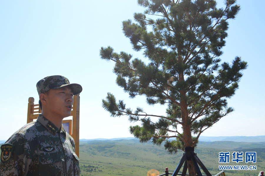 6月24日,三角山哨所,候躍敏排長在樟子松旁介紹“相思樹”的故事。新華網(wǎng) 張敏彥 攝