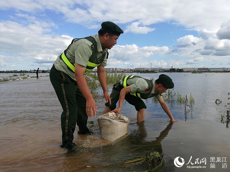 黑龍江省撫遠(yuǎn)市鴨南鄉(xiāng)境內(nèi)河水暴漲淹沒公路,邊防官兵緊急救援。