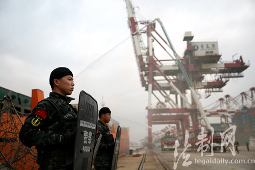 ????此次海上聯(lián)合反恐演練以阻止多名“涉恐分子”潛入港區(qū)及外輪企圖進行恐怖活動為背景,幾名“恐怖分子”駕車意圖混入油港區(qū)實施破壞,被識破后仍試圖強行進入。與此同時,前灣港集裝箱碼頭也發(fā)現(xiàn)幾名“涉恐分子”偽裝成船員,隨集裝箱貨輪進入港區(qū)實施破壞行動,并在一艘即將離港的貨輪上劫持“人質(zhì)”,企圖逃離港區(qū)。面對如此復雜的局面,公安、邊檢、海關(guān)、國檢、港口等部門接到情報預警信息后,及時啟動海上聯(lián)合反恐處突應急預案,聯(lián)合反恐指揮部及時下達指令,參加演練單位立即行動,邊檢利劍突擊隊隊員迅速登輪控制“涉恐分子”,消防部門架設(shè)水槍撲滅引燃物品,海關(guān)、海事巡邏艇在集裝箱船舶周邊海域鋪設(shè)防油污圍欄,并收繳走私涉恐物資。成功處置險情后,碼頭恢復生產(chǎn)作業(yè)。