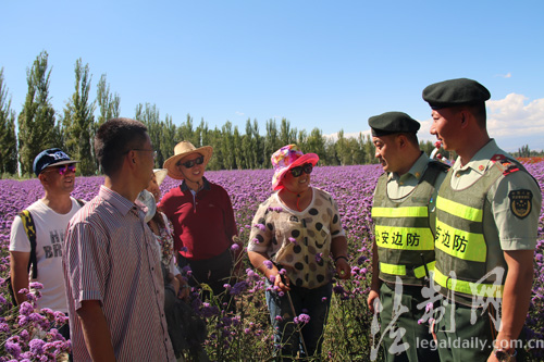 ????每年6月、7月,數(shù)萬(wàn)畝薰衣草爭(zhēng)相怒放,匯成一片紫色的海洋,吸引大量游客前去觀賞。新疆公安邊防總隊(duì)伊犁邊防支隊(duì)梁三宮邊防派出所官兵因地制宜打造“紫郁之鄉(xiāng)110”這一特色警務(wù),在治安防控、服務(wù)群眾、素質(zhì)提升等方面走出了一條新路子,用使命、責(zé)任與情感為游客保駕護(hù)航,讓游客享受一趟“滿意之旅”。